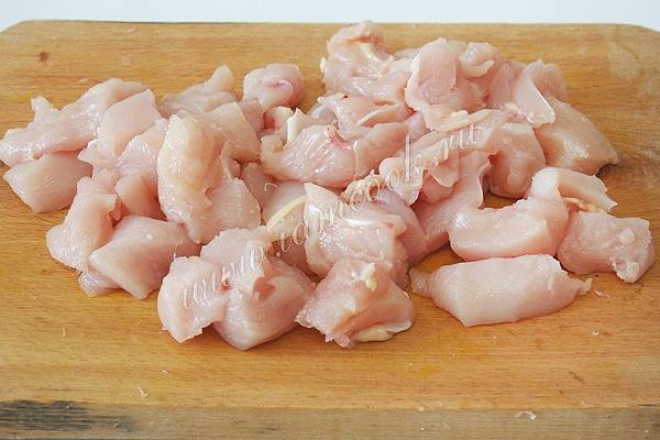 Куриное филе нарежьте кусочками размером примерно 1,5х1,5 см.