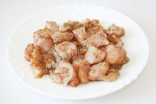 Посолите, поперчите и посыпьте приправами кусочки мяса и поставьте в холодильник на 20-30 минут.