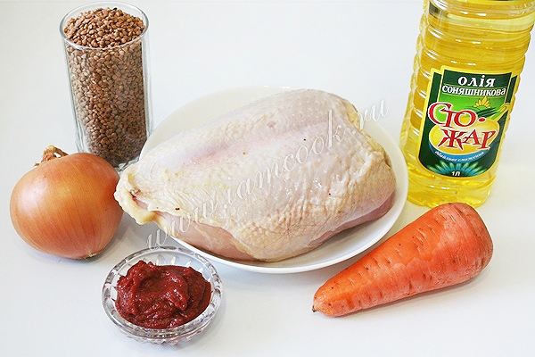Чашу мультиварки смажьте растительным маслом. Включите мультиварку в режим «Жарка» на 20 минут. Выложите в чашу мультиварки кусочки курицы и жарьте 10 минут. Через 10 минут добавьте лук и морковь. Перемешайте. Жарьте еще 10 минут. После этого всыпьте гречку, залейте разведенной в воде томатной пастой, немного посолите. Выставьте на мультиварке режим «Тушение» и тушите всё 20 минут.