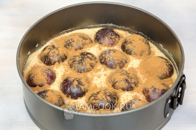 Сливы разрежьте пополам, выньте косточку. Уложите сливы срезом вниз, слегка вдавив их в тесто.