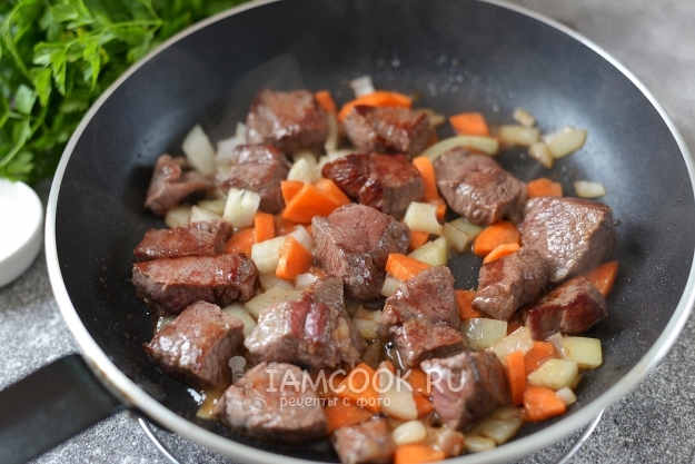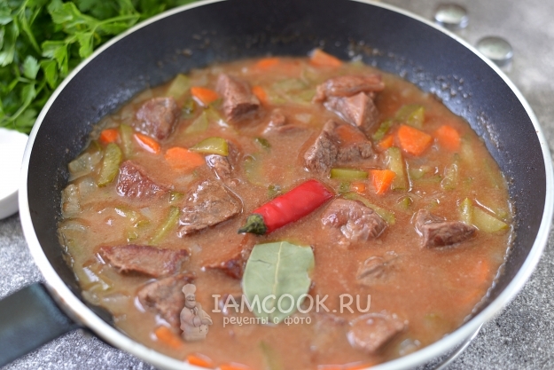 Последней добавьте рубленую петрушку, в последний раз перемешайте блюдо, выключите плиту. За это время мясо должно быть очень мягким, а волокна - хорошо разделяться.