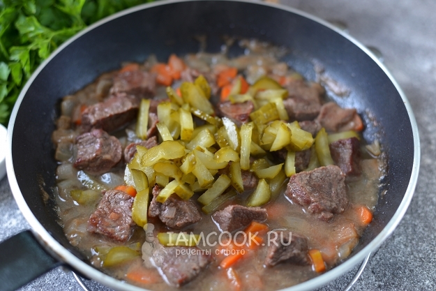 Соленые огурцы нарежьте тонкой соломкой, добавьте в сковороду к мясу, тушите на тихом огне еще минут 20-25. При необходимости подливайте воду.