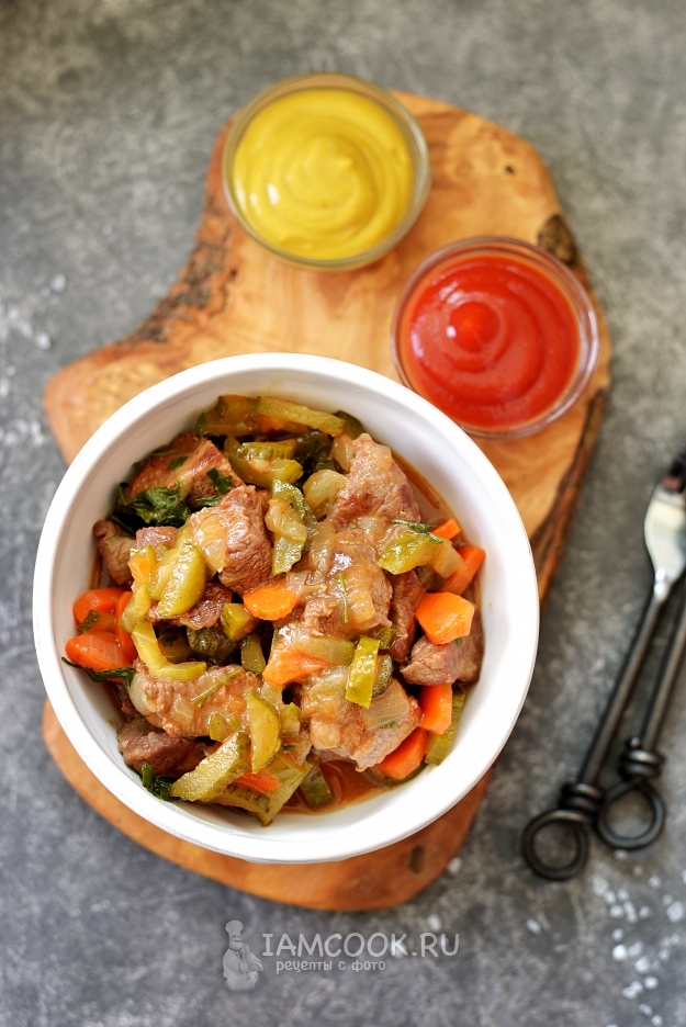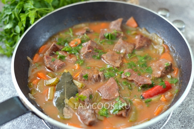 Тушеная говядина с солеными огурцами готова. Приятного.