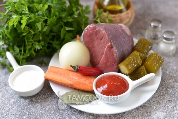 Предлагаю вашему вниманию еще один замечательный рецепт тушеной говядины - с солеными огурцами. Блюдо получается очень необычным, с невероятно вкусной кисло-сладкой подливой, которую хочется съесть до последней ложки. Такое тушеное мясо можно подать с любым гарниром - картофель или любая каша здесь будут очень хорошо сочетаться. Это блюдо запросто может обойтись без салата, соленые огурцы вполне его возместят и заменят.