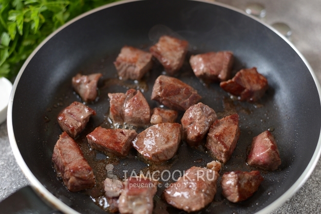 Разогрейте в сковороде постное масло, положите в него нарезанную кусочками говядину, обжарьте ее со всех сторон до румяной корочки.