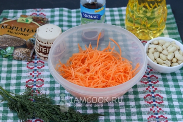 Морковь почистить и натереть на корейской тёрке. Сложить в миску с крышкой.