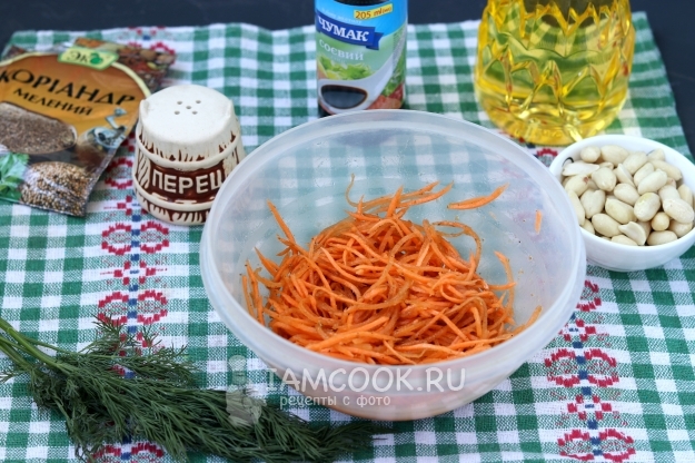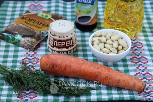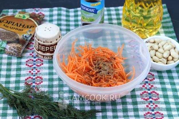 Добавить к моркови соевый соус, растительное масло, перец и кориандр.