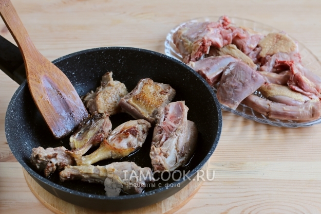 Тушку утки помоем, обсушим салфетками и нарежем кусочками. Перед тушением кусочки утки нужно обжарить. Это можно сделать на растительном масле или на жиру, который есть в брюшке утки. Для этого срежем его и растопим в горячей сковороде, а потом обжарим мясо утки со всех сторон. Сильно зажаривать не будем, ведь утка будет доводиться до полной готовности во время тушения.