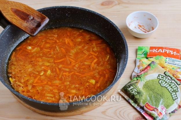 Добавим в сковороду томатную пасту, хмели-сунели и карри, вольем воду, чтобы у нас получилась подлива, в которой мы и будем тушить утку. Количество воды берите на свой вкус, смотря какое блюдо вы хотите получить, более густое или жидкое. Мне понадобился примерно стакан воды. Не забудьте посолить по вкусу.