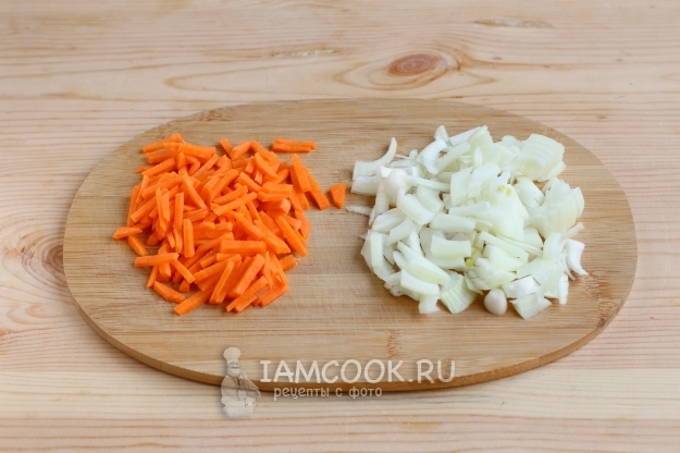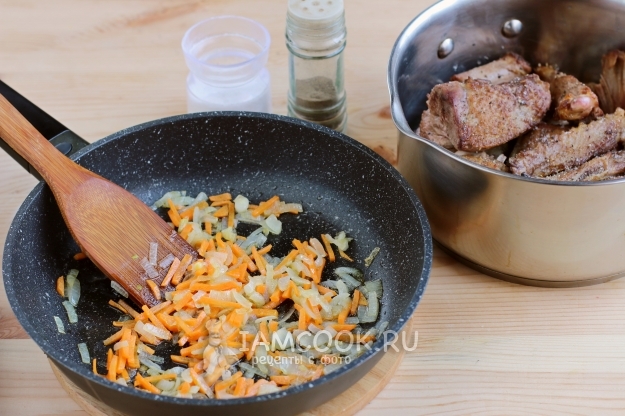 После того, как мы обжарили кусочки утки, уберем ее в сковороду, в которой будем тушить, добавим соль и молотый перец. В сковороде обжарим лук с морковью.