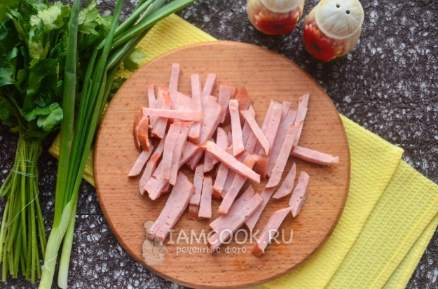 Ветчину нарежьте тонкой соломкой или кубиками. Как по мне, соломка интереснее смотрится.
