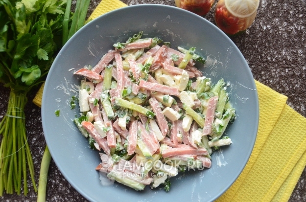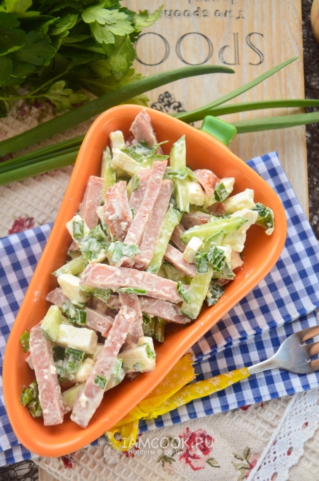 Часто готовлю такой салат, так как все его составляющие обычно присутствуют в холодильнике. Колбаса, брынза и свежий огурец идеально сочетаются друг с другом, а свежая зелень делает блюдо еще более полезным. Да и свежий весенне-летний аромат прям поднимает настроение. Заправляю я обычно нежирной сметаной, но иногда хочется и майонеза. Кстати, подойдет как магазинный, так и домашний продукт.