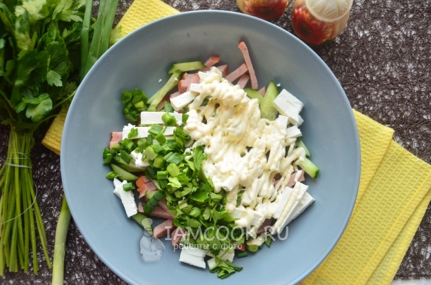 Свежую зелень мелко нарубите и переложите ко всем ингредиентам. Заправьте салат майонезом. Специи можно добавить чисто символически, чтобы придать некую пикантную нотку. Пары щепоток черного душистого перца будет достаточно.