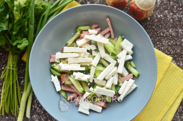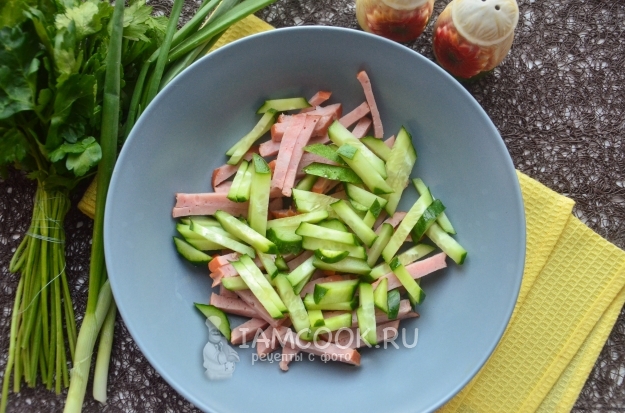 Теперь очередь свежего огурца. Не забудьте проверить его на горечь. Затем также нарежьте соломкой и переложите в салатник.