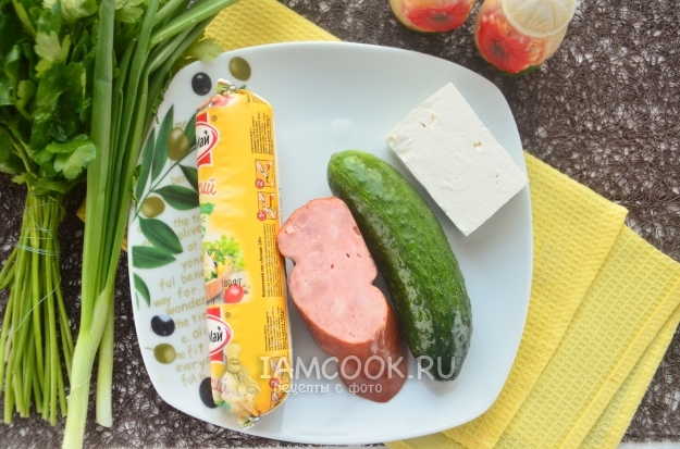 Для начала нужно подготовить все продукты для салата с ветчиной и брынзой. Этот этап заключается в том, что вы просто достаете ингредиенты из холодильника. Огурец и зелень нужно помыть, а затем обсушить. Ветчину очистите от оболочки.
