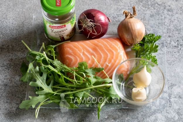 Кроме лосося, я в этом рецепте использую абсолютный минимум приправ. Каперсы (и рассол от них) можно заменить на солёный или маринованный огурец. Красный лук нужен ради его цвета, но его одного с точки зрения вкуса, по-моему, недостаточно, поэтому я беру и белый тоже. Вместо рукколы можно взять кресс или любой из горьковатых салатов. Без рукколы - скучновато чуток.