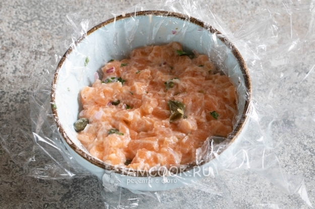 Один из самых простых способов сформировать порцию тартара аккуратным куполом - это выстлать куполообразную миску полиэтиленовой плёнкой, утрамбовать в неё тартар и перевернуть на тарелку.