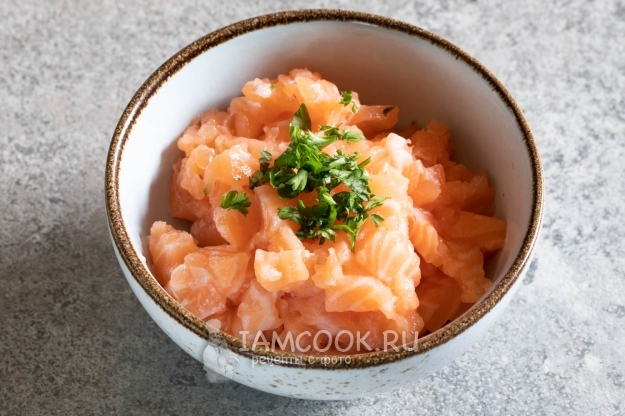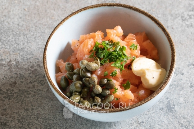 Ну, и добавить немножечко зелени с лёгкой горчинкой. Если есть желание, тартар из лосося можно декорировать дополнительной порцией каперсов.