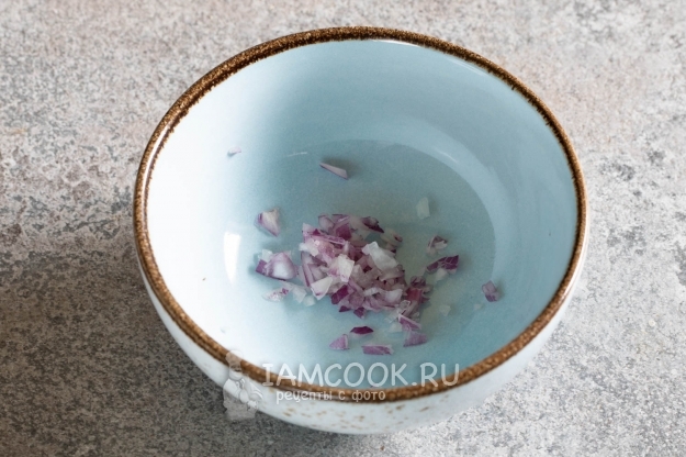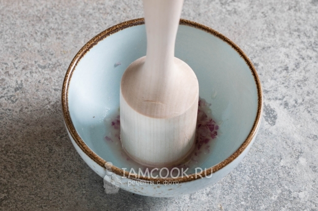 Заливаем лук рассолом от каперсов, огурцов или уксусом и хорошо толчём толкушкой.