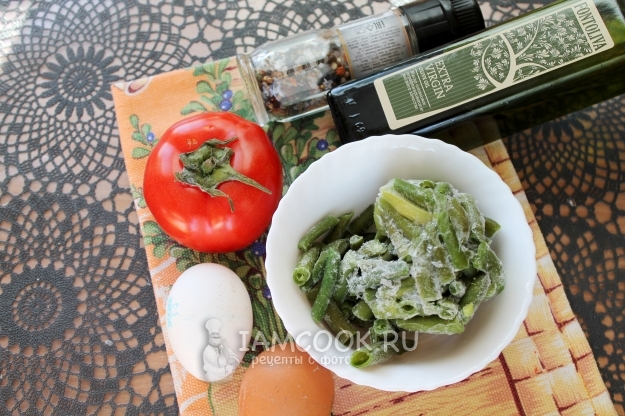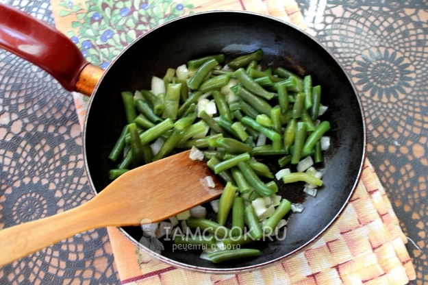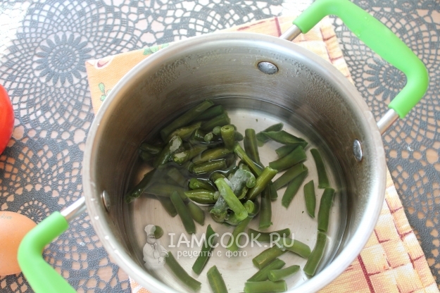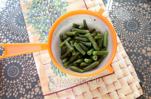 Фасоль может быть как свежей, так и замороженной, ее нужно слегка отварить в немного подсоленном кипятке - минуты 3.