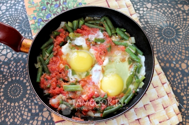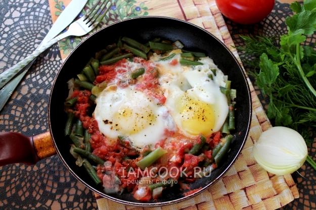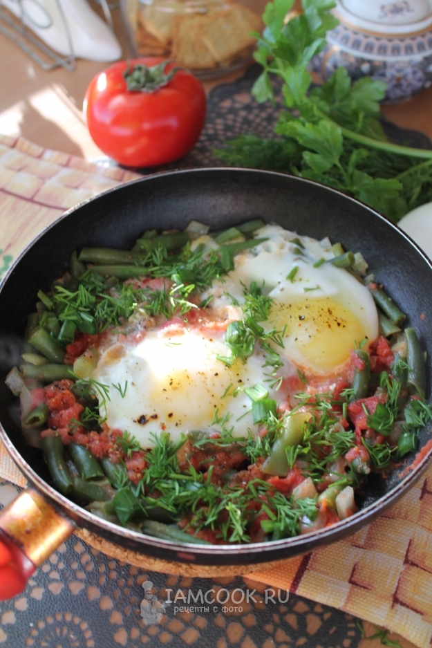 Вот и все! Шакшука со стручковой фасолью и помидорами готова. Подавайте ее в горячем виде на завтрак, можно прямо на сковороде - уже на столе каждый выкладывает свою порцию на тарелку.