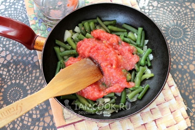 Добавьте помидорное пюре на сковороду. Немного прожарьте.