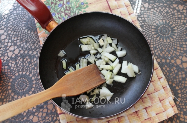 На оливковом масле прогрейте нарезанный репчатый лук, потушите его до прозрачности.