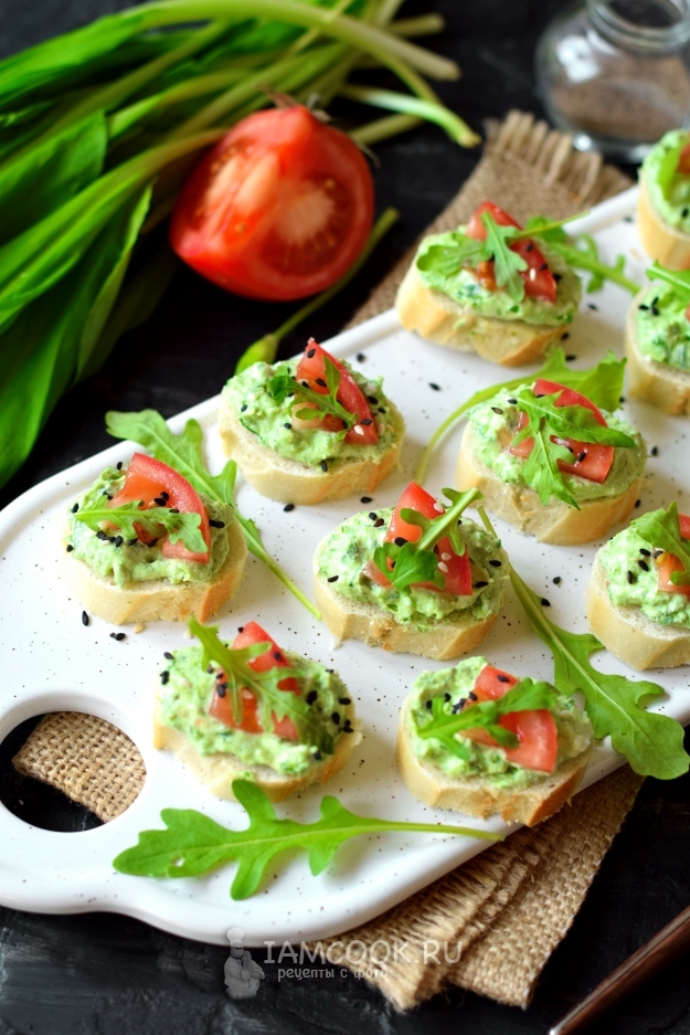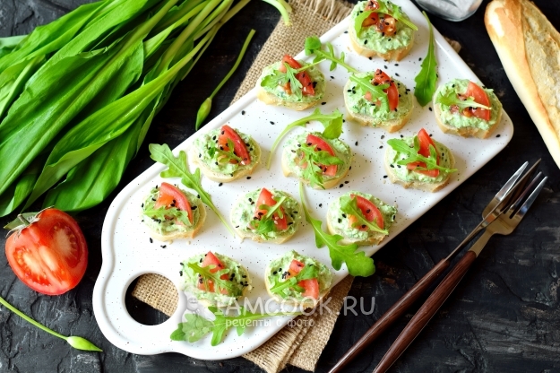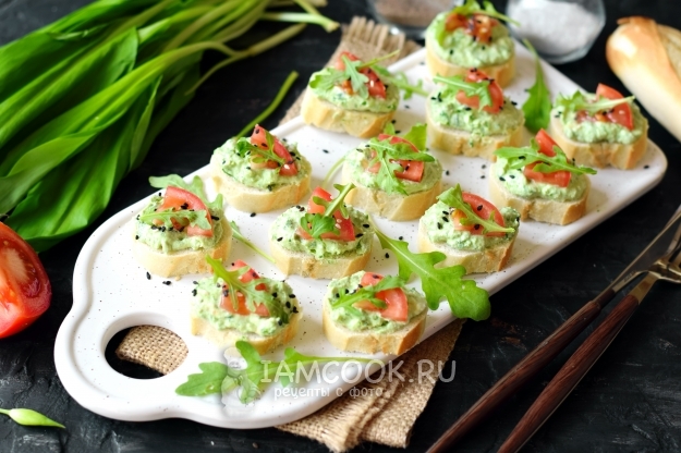 Предложенный вариант бутербродов отличается оригинальным вкусом. Творожная намазка получается очень нежной и мягкой за счет добавления сливочного масла, также она имеет пряно-чесночный вкус и красивый зеленоватый цвет благодаря черемше. Такое сочетание продуктов отменно дополнит сочный помидор. Украшать бутерброды можно любой зеленью, но руккола со своим горчично-орехово-перечным вкусом подходит больше всего.