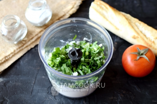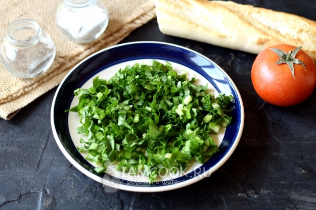 Черемшу тщательно вымойте водой, высушите и нарежьте произвольно. Нарезка не имеет особого значения, поскольку черемша в дальнейшем будет перебиваться в блендере.