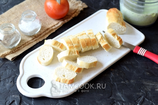 Пшеничный багет нарежьте тонкими ломтиками примерно одинаковой толщины.