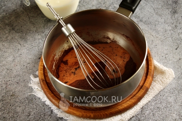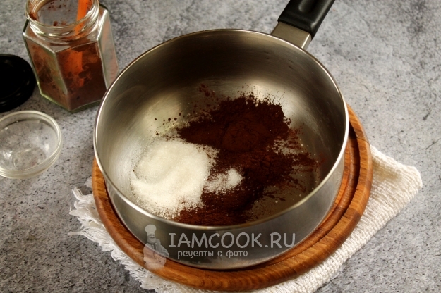 Сперва в емкости для варки смешиваем сухие продукты: сахарный песок и порошок какао. Пропорции регулируйте по вкусу.