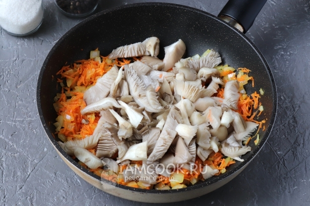 Тем временем тщательно помыть вешенки под холодной проточной водой. Обсушить и нарезать длинными полосками (или произвольными кусочками). Переложить их в сковороду с овощами.
