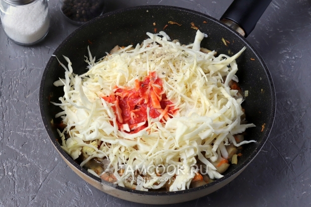 Содержимое сковороды тщательно перемешать, накрыть крышкой и томить на небольшом огне около 20-25 минут.