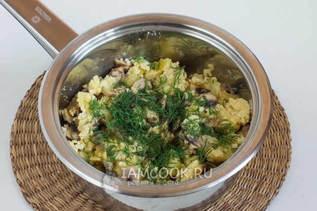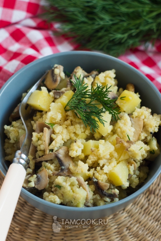 Вспушите кашу вилкой, добавьте измельченный укроп, перемешайте и горячей подавайте к столу. Свежеприготовленная пшенная каша с картофелем и шампиньонами гораздо вкуснее, «пушистее» и воздушнее, чем постоявшая.