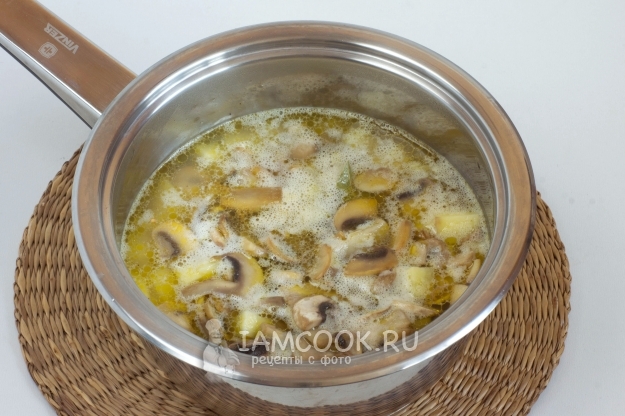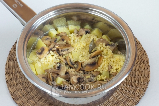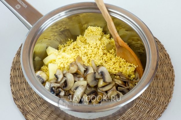 Добавьте пшено. Пшенную крупу предварительно промойте в нескольких водах и обязательно обдайте кипятком, чтобы удалить горечь. В кастрюлю положите также обжаренные грибочки.