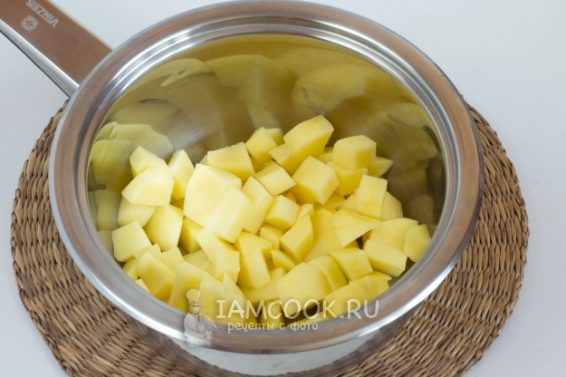Картофель промойте, почистите и нарежьте кубиками среднего размера, поместите в подходящую по объему кастрюлю.