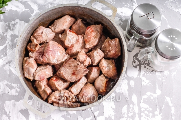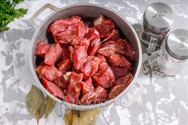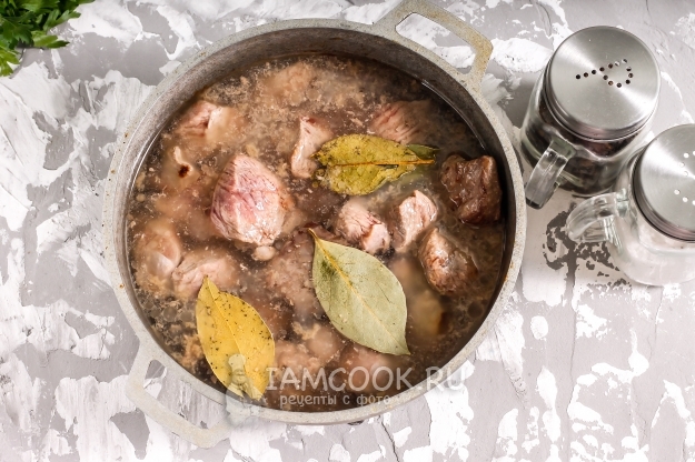 Влейте теплую воду или кипяток, добавьте лавровые листья и доведите жидкость до кипения. Удалите пену. Убавьте нагрев и томите мясо около 40 минут до мягкости. Не солите!