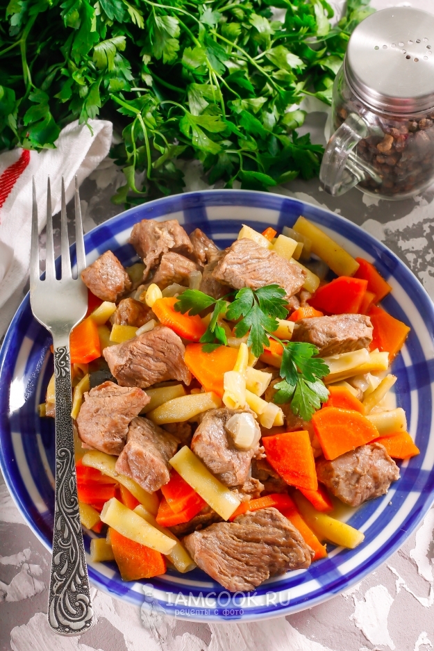 Как только на дне казана останется немного жидкости, добавьте в емкость очищенные, промытые и нарезанные овощи. Лук и морковь нарежьте средними кубиками, стручковую фасоль - брусочками. Посолите и поперчите блюдо по вкусу. Накройте крышкой и томите около 10 минут. Если потребуется немного воды, влейте кипяток.