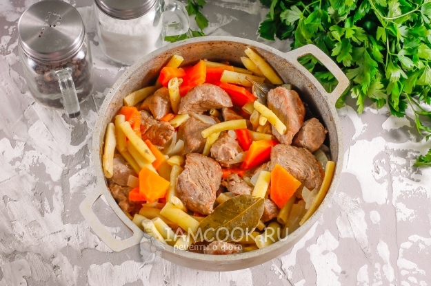 Набор овощей может быть любым, главное, в него должны входить стандартные лук и морковь. Добавляя томаты или томатную пасту, делайте это в самом конце, так как из-за кислоты, присутствующей в таком овоще, мясо будет тушиться дольше на 15-20 минут.