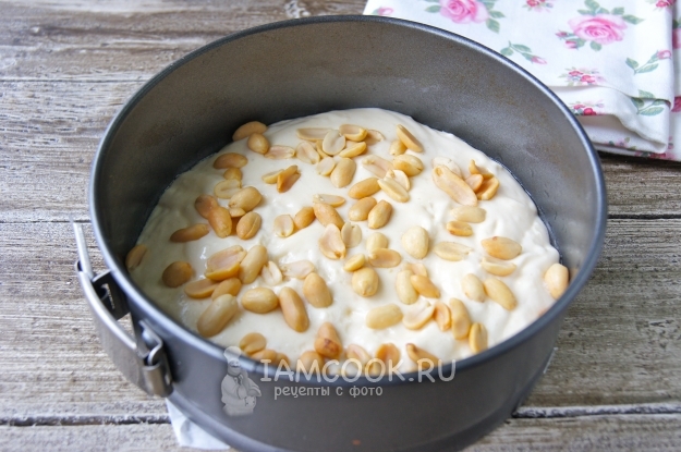 Сверху присыпьте орешками, отправьте в разогретую до 200 градусов духовку на 20-25 минут, готовность проверьте деревянной шпажкой.