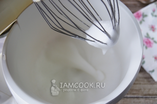 Не прекращая взбивать, всыпьте частями сахар и взбейте до плотных пиков.