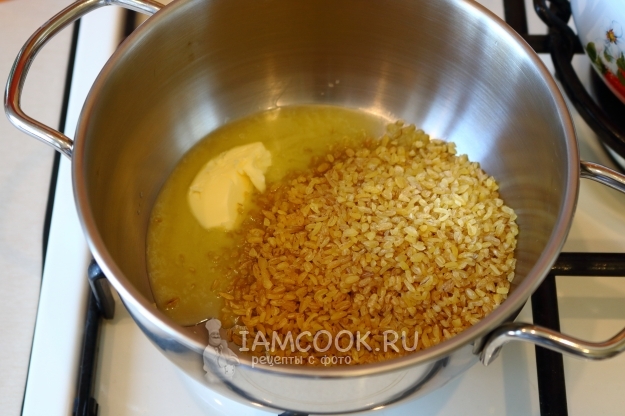 В разогретую кастрюлю выкладываем сливочное масло и булгур.