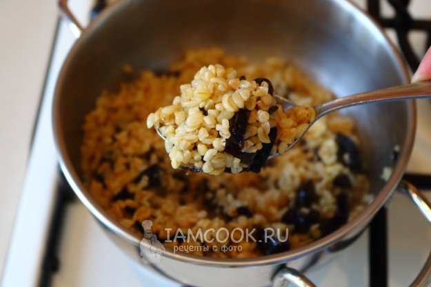 Перемешиваем и варим до готовности булгура и полного впитывания влаги (5-7 минут). Готовую кашу оставляем настояться под крышкой на 10 минут.