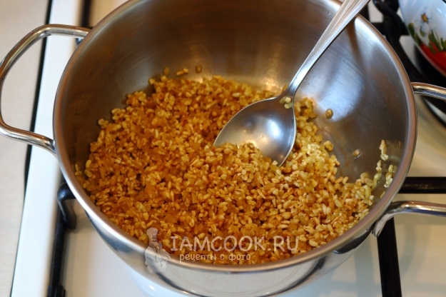 Поджариваем крупу на небольшом огне до золотистости.