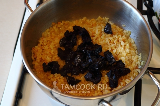 Когда почти вся жидкость впиталась, перекладываем в кастрюлю подготовленный чернослив.