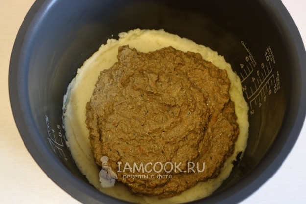 Формируем запеканку. На дно смазанной чаши выкладываем половину картофельного пюре. Сверху идет начинка из печени и овощей.
