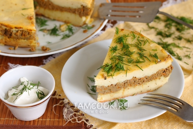 Завершает слой картошки. Готовим запеканку из картофельного пюре в мультиварке в режиме «Выпечка» 60 минут, после чего полностью остужаем в чаше, вынимаем на блюдо и подаем к столу.