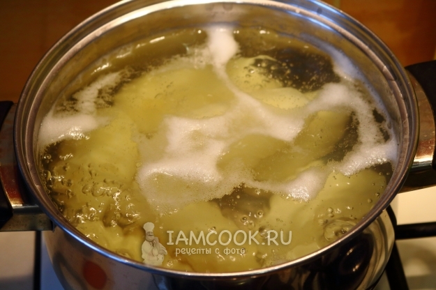 Картофель очищаем, перекладываем в кастрюлю, заливаем водой, чтобы она полностью покрывала овощи, и варим до готовности (около 30 минут).