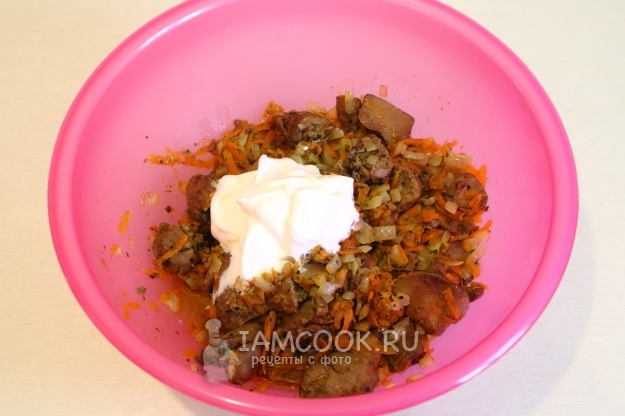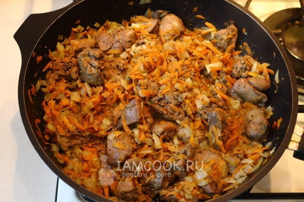 Перемешиваем и тушим под крышкой до готовности печени - 10-15 минут.