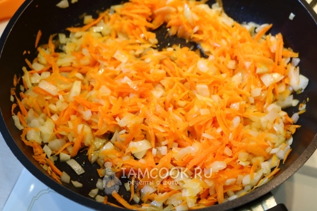 Морковь с луком выкладываем на сковороду с растительным маслом и тушим до мягкости.
